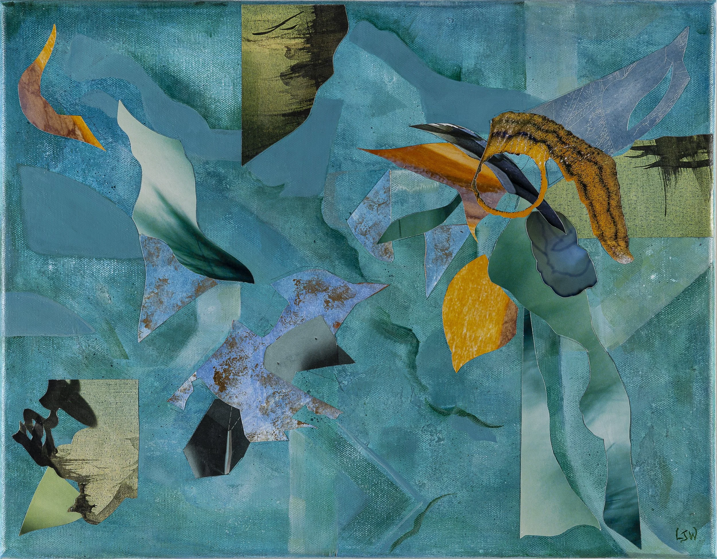 Lauren Worth, FLUX 5, 2026, Mixed Collage on Canvas, 10 × 10 × 1 1/4 in, $1,000