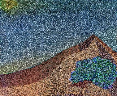 I usually draw the figures small relative to large natural forms around them. This feels right to me, because, when I'm near hills, caves, lakes, or trees, I feel minute compared to their grandeur. For me, the meditation experience naturally diminishes my ego, a good thing. Altars in nature with small