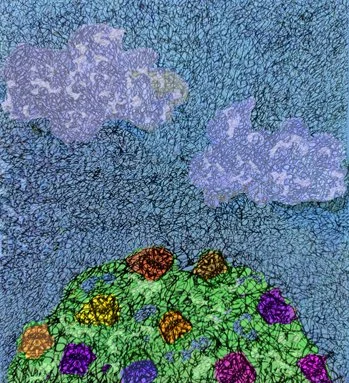 When I yield to the meditation process and let go of busy thoughts, I feel at one with a great inner expanse. Sometimes I see a colorful aurora borealis in my inner eye, and, at other times, a rich dark blue. Perhaps, that's why I draw vibrant compositions with people meditating in or near the sky. In the drawing below, one person sits on the ground with hovering clouds, colored by sunset, sinking low towards her. Another meditator is so drawn to the atmosphere that she levitates above the earth. At its best, to me, meditation feels like suspension in the ether, complete freedom.