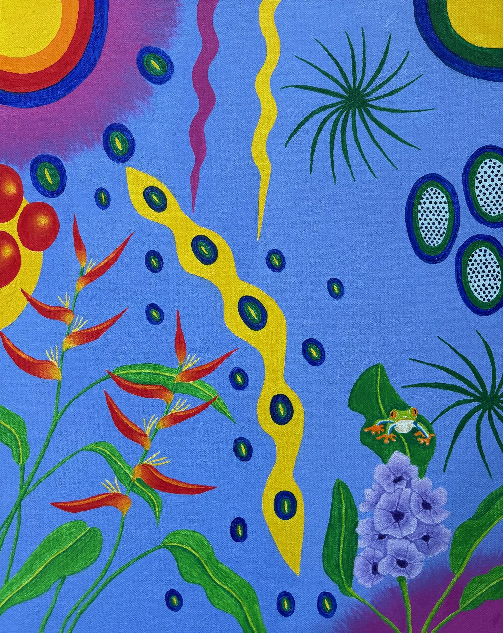 Oenone Hammersley, Tropical Garden with Red Eyed Tree Frog, 2026, Oil on Canvas, 20” x 16”, $1500