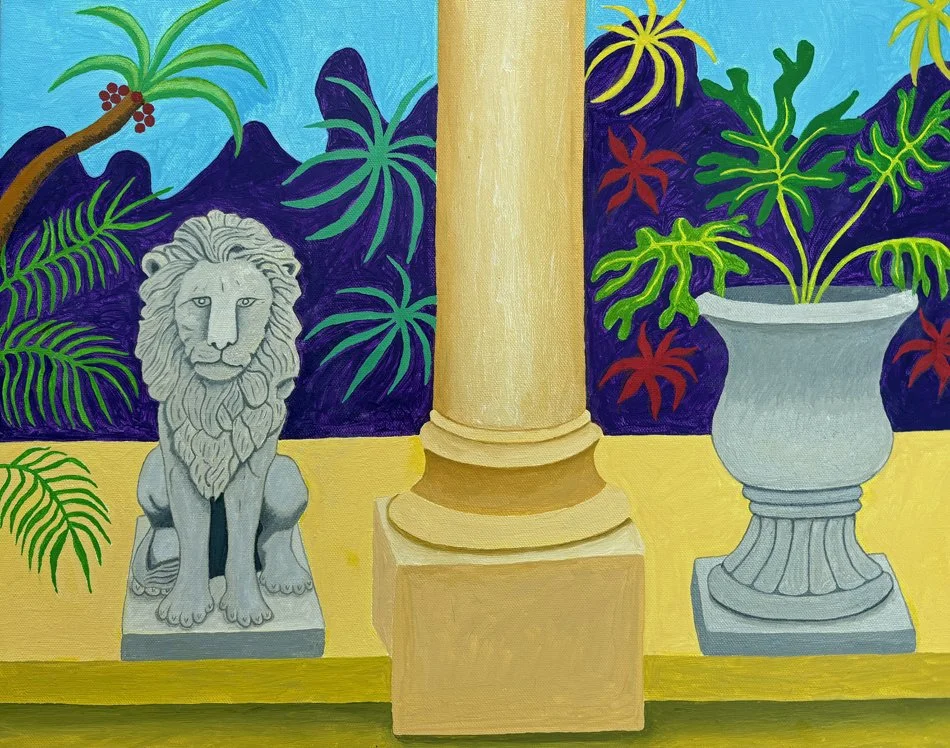 Oenone Hammersley, Courtyard with Lion, 2026, Oil on Canvas, 23.5” x 16.5”, $2500